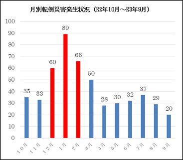 『福島冬季転倒災害防止運動(転ばないでね!)』を実施します1 趣旨福島労働局では、令和3年の福島労働局管内の休業4日以上の死傷災害(以下「死傷災害」という。)が4月末時点で前年同期と比べて6割を超える大幅な増加となったことから、6月10日に「労働災害多発注意報」(以下「注意報」という。)を発令しました。しかしながら、注意報発令後、9月末時点での死傷災害は前年同期と比べて3割以上の増加と多発傾向に歯止めがかかっていない状況にあります。死傷災害の中で最も件数が多い転倒災害については、その4割が降雪・凍結の冬季に発生していることから、福島労働局では、降雪・凍結期間前の11月を準備期間、転倒災害が多発する12月~2月までを本運動期間として、『福島冬季転倒災害防止運動(転ばないでね!)』を実施します。 事業者及び労働者への注意喚起を図り、職場における転倒リスクの総点検と、必要な対策を講じていただくことにより、冬季の転倒災害発生の削減に向けた取組を展開します。 2 福島県内における労働災害の増加と転倒災害の発生状況![]() ![]() ![]() ![]() ![]() 3 実施期間(準備期間)令和3年11月1日から令和3年11月30日(運動期間)令和3年12月1日から令和4年2月28日 4 実施事項(凍結前の準備と確認!身体機能の確認を!)