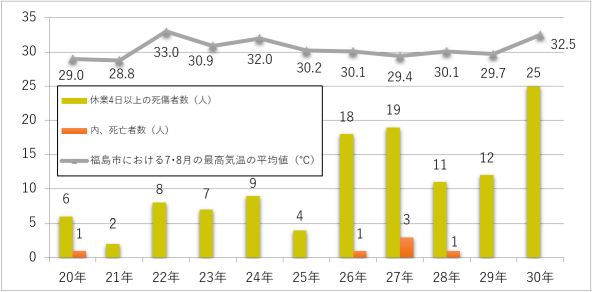 熱中症を防ごう!〇福島県内の熱中症による死傷者数福島県内の平成30年の熱中症による労働災害については、死亡者数は2年連続で0人であったものの、休業4日以上の死傷者数は25人で、平成29年と比較して倍増しました。また、建設業においても、平成30年の熱中症による休業4日以上の死傷者数は10人で、前年から倍増しています(平成29年は5人)。職場における熱中症による死傷者数の推移(平成20~30年)(単位:人)