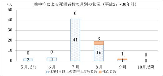 ![]() 月別発生状況(平成27~30年)過去4年間(平成27~30年)の月別の熱中症による死傷者数をみると、全体の約9割が7月及び8月に発生しています。時間帯別では、11時台及び14~16時台に多く発生しており、作業を終了して帰宅後に体調が悪化して病院に搬送されるケースもあります。![]() 熱中症を予防するため、 「喉の渇きにかかわらず水分・塩分の摂取」、「こまめな休憩の確保」、「暑さに慣れる期間の設定」、「労働者の異変を認めたときの救急隊への要請」 などに取り組みましょう。 |